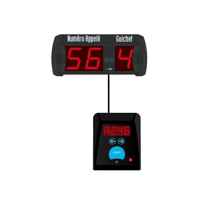 Afficheur numérique de file d'attente avec numéro d'appelé à 3 chiffres et numéro de guichet à 1 chiffre. Plusieurs afficheurs numériques peuvent être raccordés ensemble en parallèle. Lorsque les opérateurs ont des appels fréquents, le système permet de créer des configurations "historiques". De cette façon, il sera possible de voir l'appel en cours et l'appel précédent.