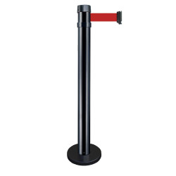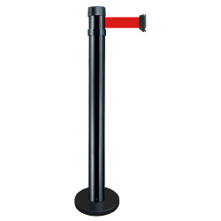Poteau de guidage à sangle rétractable à fixer au sol grâce à une platine. Sangle d'une largeur de 5 cm, elle d'une longueur jusqu’à 440 cm.