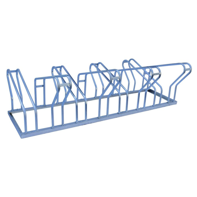 Rack à vélos Viso permettant de ranger 2 x 4 vélos, modèle en acier zingué à poser au sol. Rangement des vélos de chaque côté. Fixations en accessoires (4 x D.16 mm). 1 espace de rangement vélos sur 2 est équipé de petites barres horizontales en acier afin de surélevé la roue avant du vélo de façon à obtenir un rangement optimal entre les vélos. Il présente l'avantage d'être moins encombrant qu'un rack 8 vélos classique.