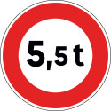 Panneau interdiction signalant l'interdiction d'accès aux véhicules, véhicules articulés, trains doubles ou ensemble de véhicules ayant un poids total autorisé en charge ou un poids total roulant autorisé de plus du nombre de tonnes indiqué (B13). Il peut être placé, le cas échéant, au-dessous de ce panneau, un panonceau d'indications diverses (M9) formulant certaines règles complémentaires (nombre maximum de véhicules admis à passer simultanément sur un pont, position axiale obligatoire, etc.).
