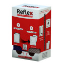 Conçu de façon simple, mais efficace, le REFLEX est fabriqué dans un emballage en carton 100 % recyclable, de couleur vive, peu encombrant et très léger. Les témoins de remplissage, présents des 2 côtés, concèdent une visibilité immédiate des produits, permettant ainsi une disponibilité et une rapidité d’utilisation à tout moment.