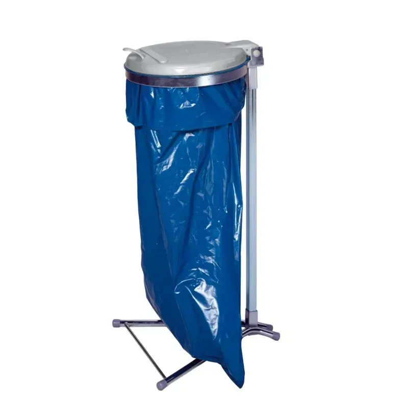 Support sac poubelle stationnaire sur pied doté d'un couvercle. Pour sac poubelle d'une contenance en déchets de 120 litres. Existe également en version mobile et murale.
