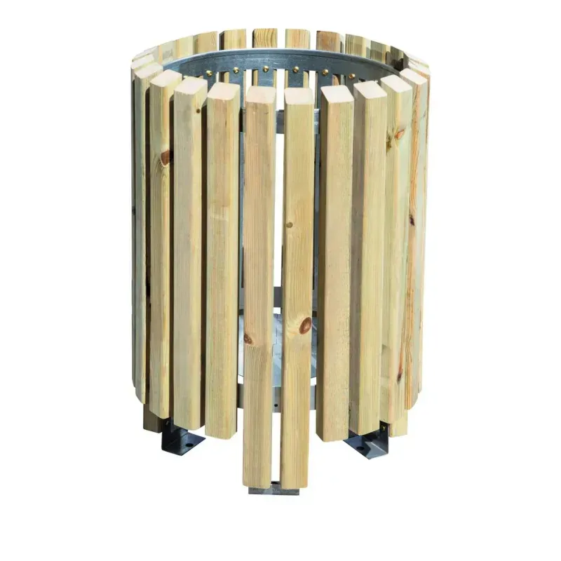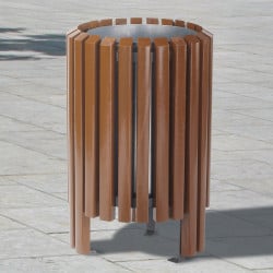 Poubelle de ville en bois ronde disponible en bois exotique ou en pin du nord traité autoclave classe 4. Mobilier urbain vendu sans couvercle.