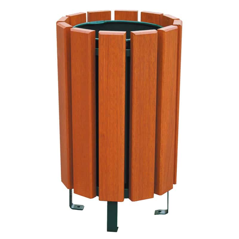 Poubelle extérieure ronde disponible en bois exotique ou en pin du nord traité autoclave classe 3 ou en pin du nord verni couleur châtaigner. Mobilier urbain vendu sans couvercle. Livré avec un seau amovible pour les déchets ainsi que d’un socle.