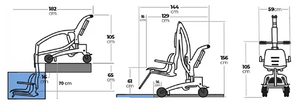 - Idéal en milieu humide : roues adaptées, siège hydrofuge, les pièces entrant dans l'eau sont en acier inoxydable.