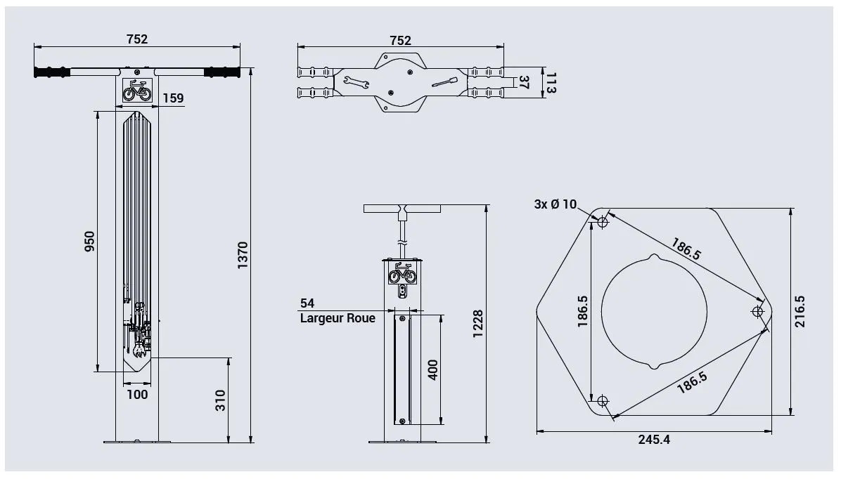 - Fixation sur platine avec 3 points d’ancrage Ø 10 mm (fixations non incluses)