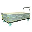 Chariot de transport pour estrade modulable en bouleau, peut recevoir au maximum 8 unités, 2 roues fixes et 2 roues pivotantes non freinées.