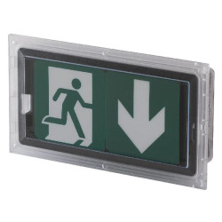 Design translucide et discret : Son corps transparent permet de réduire l'empreinte visuelle uniquement au pictogramme. Sa forme rectangulaire et plate s'intègre parfaitement dans la perspective du bâtiment.
