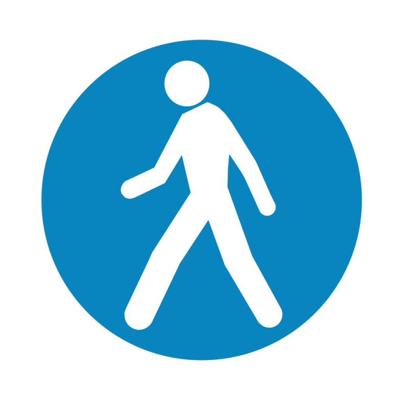 Adhésif de marquage au sol extérieur avec pictogramme "Obligation piétons". Conforme StreetApp IP 2555. Traité anti UV. Un nettoyage en profondeur est impératif avant la pose.